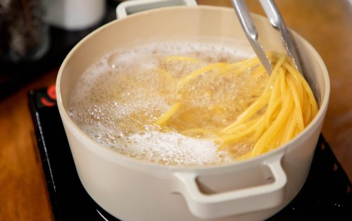 1.ตั้งน้ำสำหรับต้มเส้น ใส่เกลือ ต้มเส้นบูคาตินีให้ได้ระดับ al dente และเก็บน้ำต้มเส้นไว้ประมาณ ½ ถ้วย