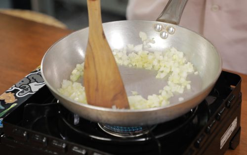2.ตั้งกระทะใส่น้ำมันมะกอก ผัดกระเทียมและหอมใหญ่ด้วยไฟกลางจนหอมและสุกใส