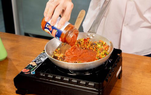 4.ใส่ซอสโบโลเนสจากเนื้อพืช และน้ำต้มเส้น เคี่ยวด้วยไฟอ่อนจนซอสข้นและหอม