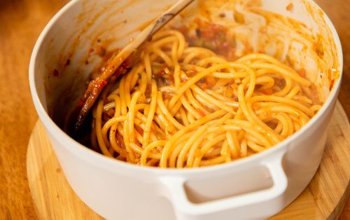 5.ใส่เส้นบูคาตินีลงไป เคล้าให้ซอสเคลือบเส้นอย่างทั่วถึง