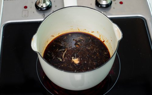 1.Combine soy sauce, mirin, sake, and dried bonito flakes in a small saucepan.