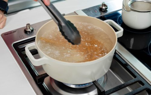 2.ต้มเส้นสปาเก็ตตี้ให้ได้ระดับ al dente ล้างด้วยน้ำเย็นจัดจนเส้นเย็นและเด้ง สะเด็ดน้ำ