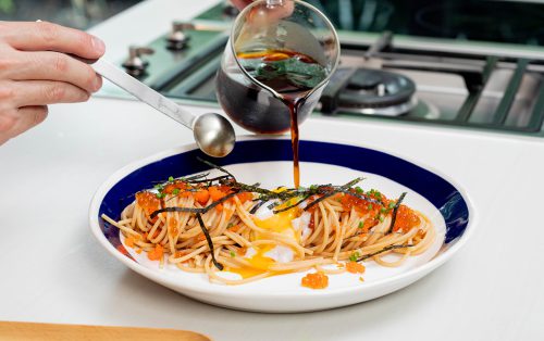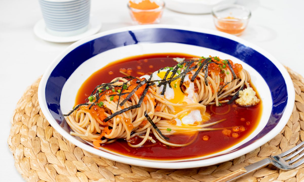 Zaru Spaghetti (Chilled Whole Wheat Spaghetti with Tsuyu Sauce) Inspired by Zaru Soba, this Japanese-style chilled noodle dish is reimagined with aromatic, chewy whole wheat spaghetti. It’s paired with a refreshing, savory tsuyu dipping sauce and served with toppings like onsen egg, salmon roe, shrimp roe, and shredded nori.